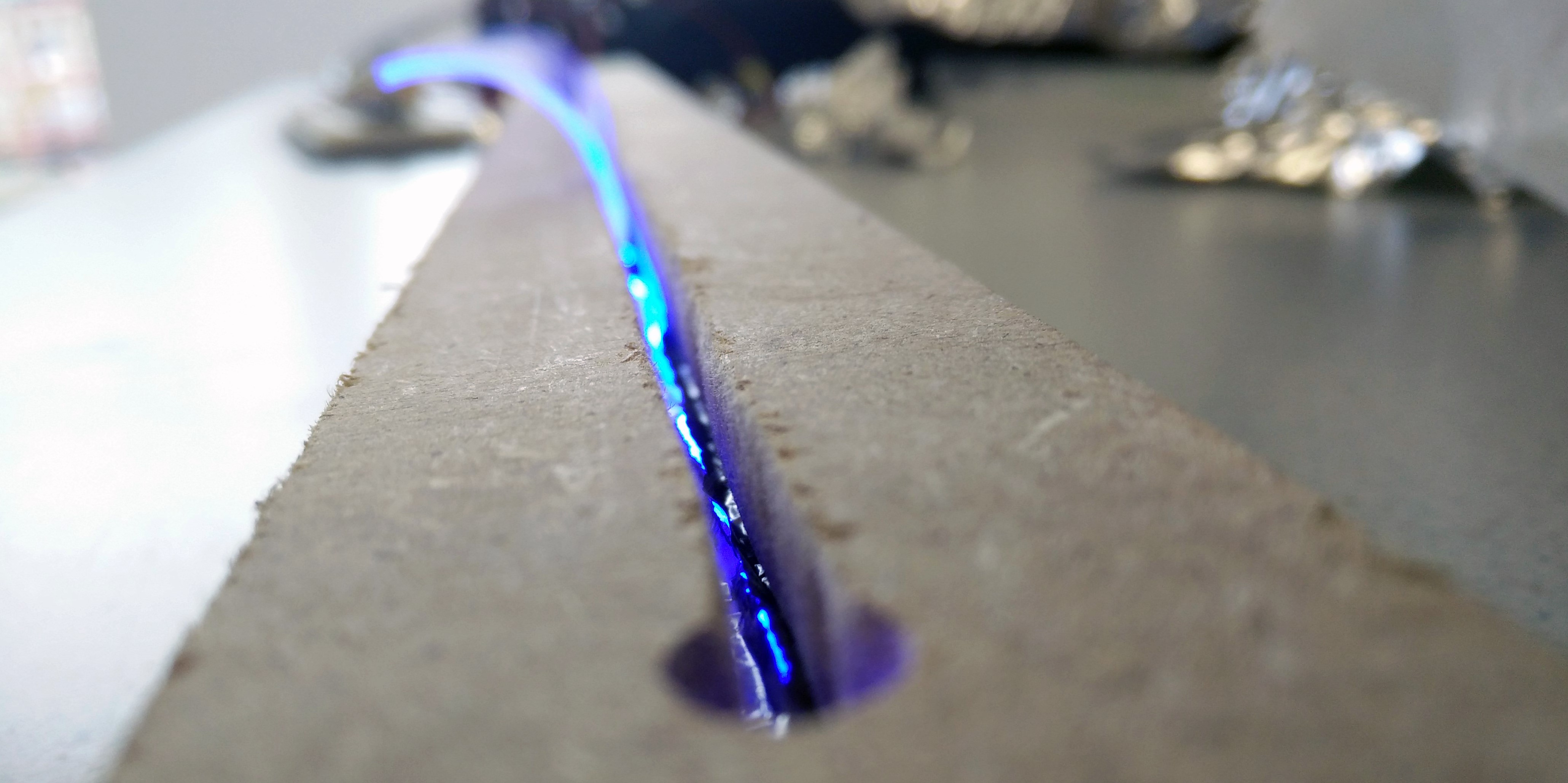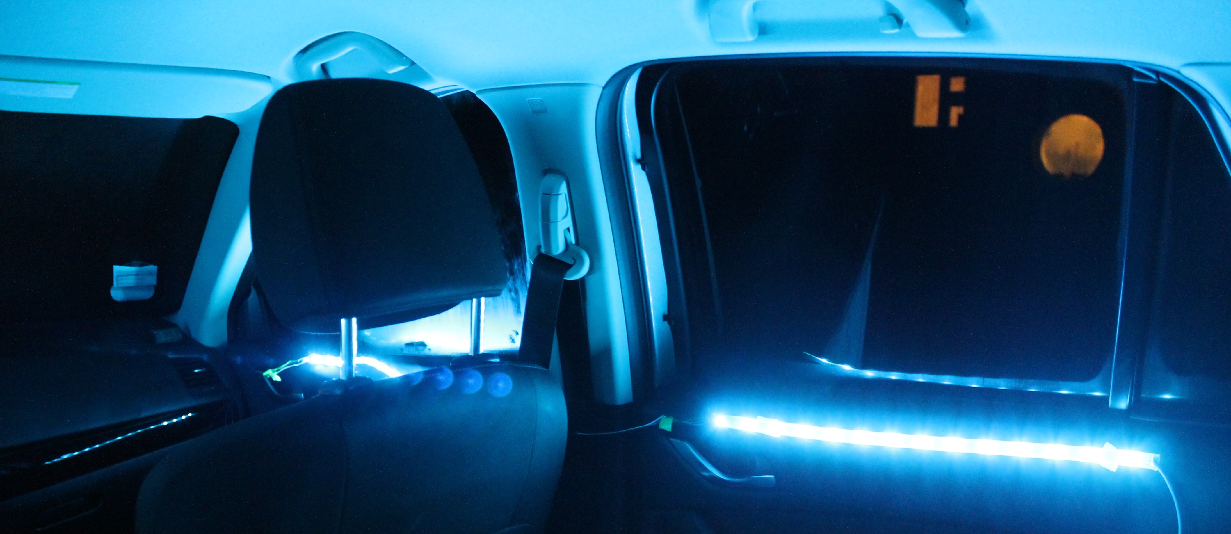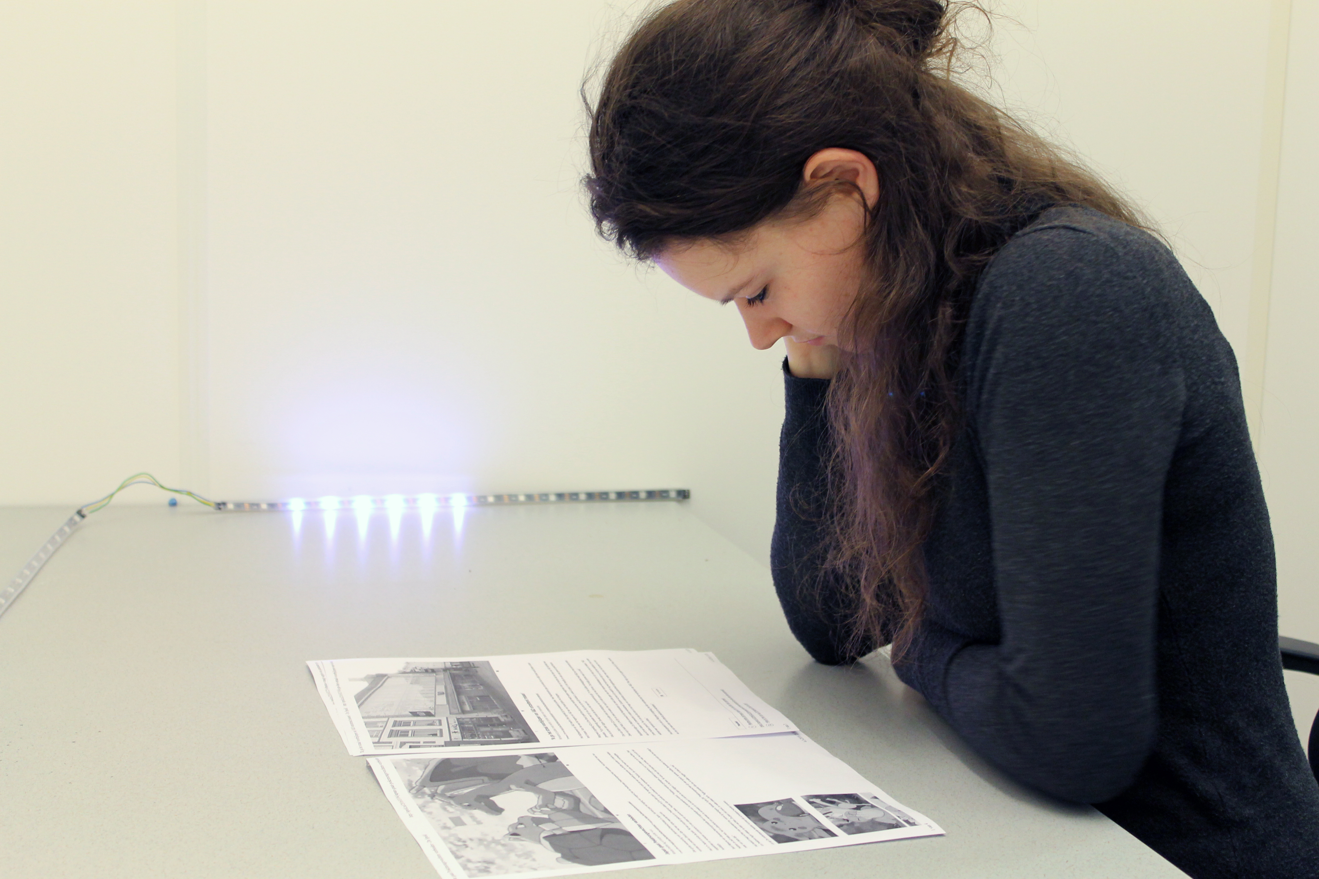 A participant taking part of a study to sensitivity of the peripheral vision. Just as discussed in literature, people tend to be more sensitive to light intensity and movement rather than light colour in the peripheral field of view. A similar test was conducted in car to gather user input about the light animations that convey the different messages like stop, right turn, left turn etc.